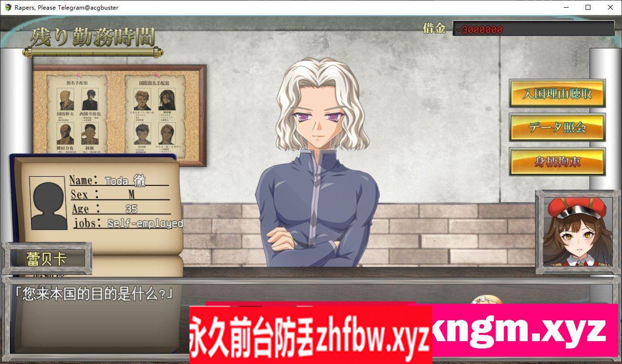 该翻译补丁由[butoa]大佬制作分享 ▼故事 为了还债在某风俗店工作的蕾贝卡。 对那样的生活感到厌烦,决定不干了。 然后跑进了店长的房间。 虽然店长反对了蕾贝卡的辞职,但丽贝卡却仍旧要辞职。 店长也没办法,只好向丽贝卡介绍入境监察官的工作。 入国监查官的工作虽然待遇很好,但也有14日的试用期,必须时合适的人才可以当选。 而且在那个期间必须想办法偿还借款300G。 而且,考虑到说不定今后没有待遇这么好的工作,蕾贝卡最终决定了作为入境监查官工作。 蕾贝卡能在14天内还上债吗。 ▼游戏概要(入境监查官模拟游戏) 作为入国检察官以防止坏人,恐怖分子入国为目的进行检查。如果有坏人通过的话治安将会变差,国际恐怖分子通过的话治安则会更加的恶化。最坏的情况说不定还会被强奸……。 不让可疑的人通过,或者详细调查一下吧。 另外,入境者中也有诱惑蕾贝卡的人。 虽然是所谓的卖淫,但是为了还债还是尽量OK比较好吗…… 审讯室也一样,可以赚钱。 ▼卖点 动画! 多个场景(21个场景)! 随便性骚扰! 多结局(结局有8种)! 有卖淫! 全语音(声优:鳴森りいあ)!