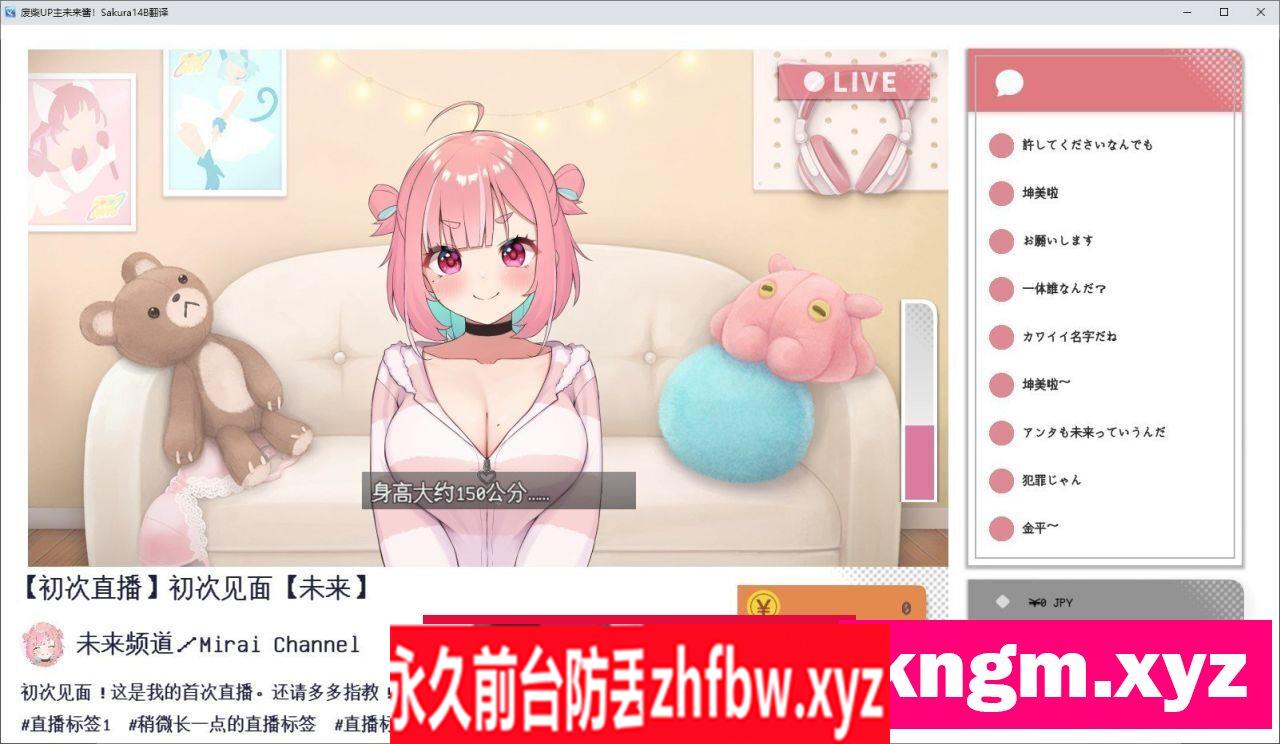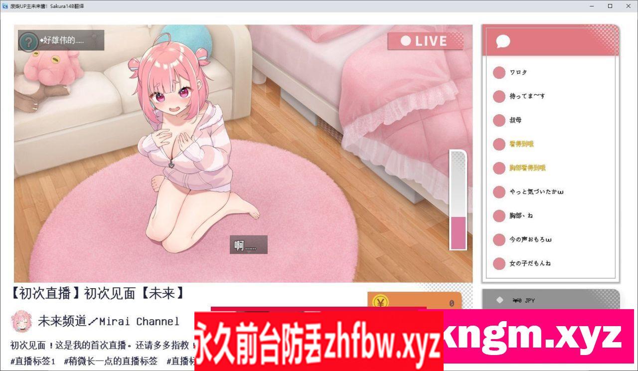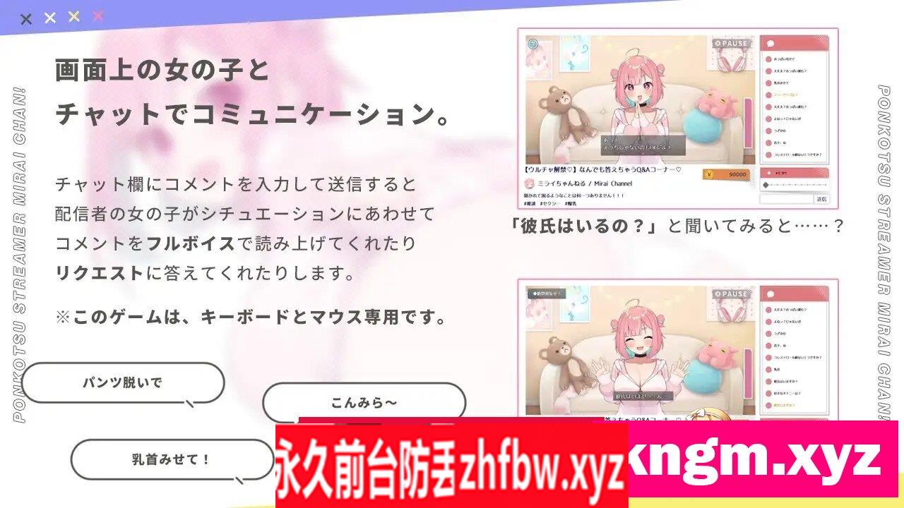 该翻译补丁由[butoa]大佬制作分享 与主播进行色情互动 与笨拙的主播未来酱进行色情交流,让直播更加热闹! 即使发表“让我看看胸部”之类的性骚扰言论也没关系! 反而可能会让兴奋的未来酱延长直播,提供特别服务? 未来酱的各种反应 通过输入评论,未来酱会给出各种反应。 例如,当你对展示性感内衣的未来酱发表评论时的反应是这样的……。 功能介绍 [DM功能] 与未来酱关系变好后,她会私下给你发消息。 比如“我马上要直播了,来看吧”之类的。 甚至可能还有不让其他听众看到的色情自拍照片……。 [打工] 可以使用直播功能的超聊天来支持未来酱。 为此,你需要赚钱。 打工不仅能赚到钱,还有机会在现实中与女主角偶遇。 [结果] 直播结束后会显示结果。 看过的直播可以重复播放, 让我们以S评价为目标来玩吧。 [ASMR直播] 甚至会用KU-100录制高质量的ASMR直播……! “ASMR让我耳朵痒痒的,不太喜欢……” 这样的人也可以放心,我们准备了跳过功能。 与未来酱的互动从直播到现实 与未来酱关系变好后,实际上可以见面做色情的事情。 平时在屏幕上看到的巨大胸部,就这样出现在眼前……。 大家的直播者未来酱,成为你一个人的。 角色介绍